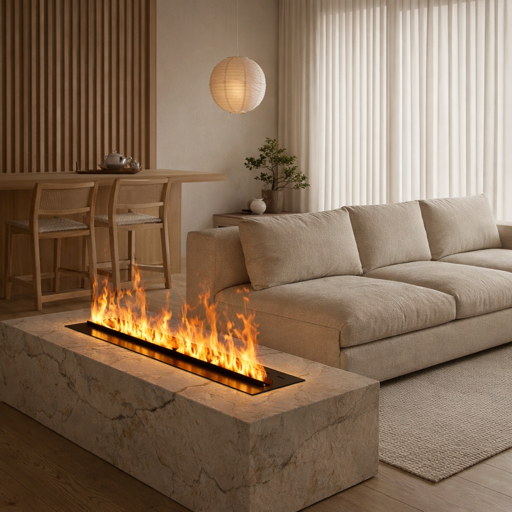 In de haard bevindt zich een geïntegreerde verdampermodule (transducer). Deze zet kraanwater om in koude, zichtbare waterdamp. De damp wordt door de lampen visueel versterkt, waardoor het lijkt alsof er echte vlammen dansen in de haard. Omdat er geen gebruik wordt gemaakt van een verwarmingselement of gloeispiraal, is het energieverbruik laag en blijft de haard veilig aanvoelen, ook bij langdurig gebruik.